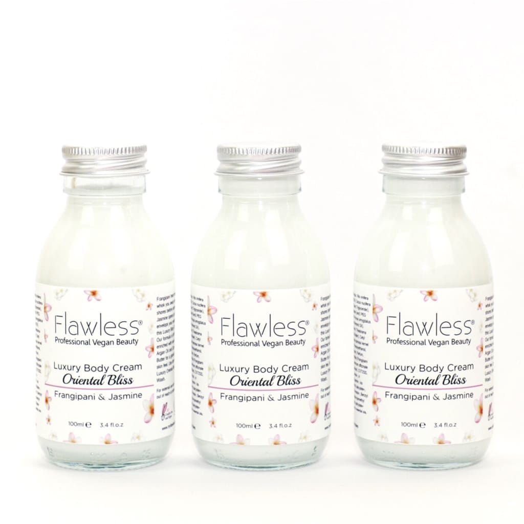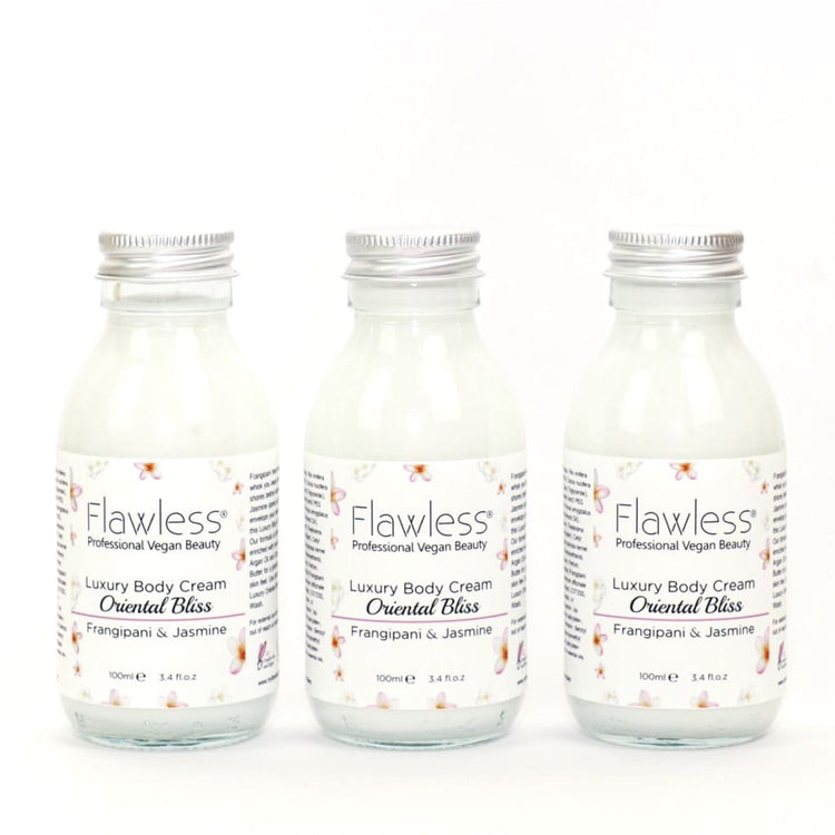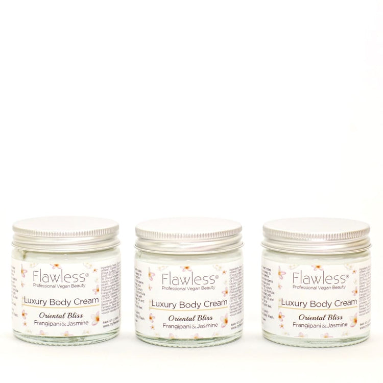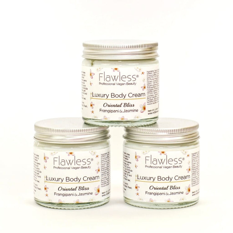 The Flawless moisturising body cream ranges have been created to leave your skin feeling beautifully soft and nourished all day long. The light floral blend of Frangipani and Jasmine in the Oriental Bliss formula will give your skin a hydration boost whilst leaving it delicately fragranced. Made with Cocoa Butter, Argan Oil and Grapeseed Oil to hold in moisture and soothe your skin.  All of our Body Creams are cruelty free, vegan friendly, plastic free and made with sustainable ingredients.